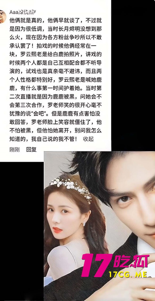 近期微博热搜突然曝出已婚男明星出轨女演员的惊天大瓜,大家就像瓜田里的猹一样,这吃一口那吃一口,因为正主究竟是谁急得团团转!某男明星粉丝会曾经的高管曝光了这瓜的男女主角:罗云熙和白鹿!都是俊男美女谈个恋爱其实也没什么。但他们属于公众人物不能轻易公布恋情,而且罗云熙还是在婚内和白鹿在一起的。白鹿和罗云熙现在都是一线明星,两人合作的电视剧也不少。经常在一起,天天见,日日见,哪有没感觉的。